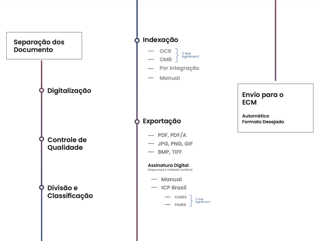 Com esta ferramenta, é possível reconhecer e extrair conteúdos de imagens, digitalizar documentos com alta qualidade, além de gerar arquivos de formatos variados para guarda e preservação eletrônica. Tecnologia aplicável nos Bureaus de Produção: escritórios de digitalização que veremos como funcionam mais a frente, todos os documentos digitais gerados em nossa plataforma terão validade legal.